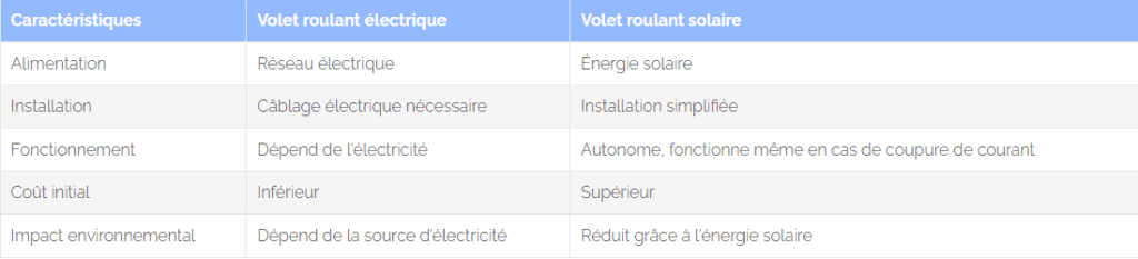 - Coût : Le coût initial d’un volet roulant électrique est généralement inférieur à celui d’un volet solaire.